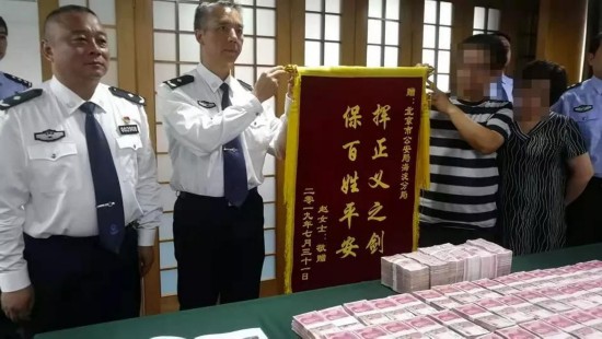 8月1日下午,事主李强(化名)在北京海淀公安分局激动地领回了16根金条、230余万元人民币和67万美金等被盗财物。嫌疑人长途跋涉驾车来京,混进高档小区地下室,将500余万人民币、67万美金和16公斤黄金洗劫一空,并用砖头替换金条,以防被发现。