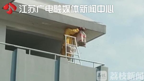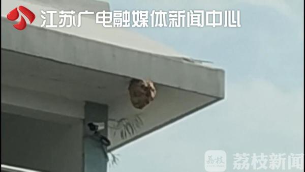 暑期,空荡荡的校园竟然闯入了"不速之客"。扬州市宝应县城中小学的一处教学楼上,出现了一个足球大小的马蜂窝,8月1日,当地消防部门出动,摘除了这个马蜂窝。