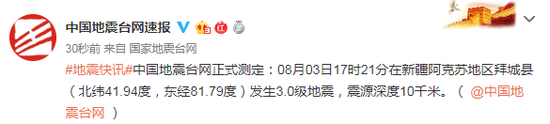 #地震快讯#中国地震台网正式测定:08月03日17时21分在新疆阿克苏地区拜城县(北纬41.94度,东经81.79度)发生3.0级地震,震源深度10千米。