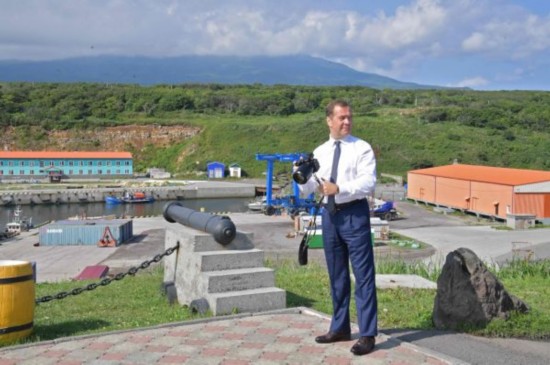 俄罗斯总理梅德韦杰夫2日在择捉岛上拍照(法新社)