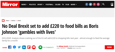 《每日镜报》称,分析显示,如果英国退出欧盟,明年英国人的购物账单金额将增加。具体来看,报道援引英国萨塞克斯大学的专家分析称,由于关税和供应链的问题,食品价格明年预计将上涨7%左右。其中,乳制品价格可能上涨9.8%,肉类上涨2.9%,油脂价格可能上涨13.2%。英国央行也警告称,“无协议脱欧”将进一步打压英镑。