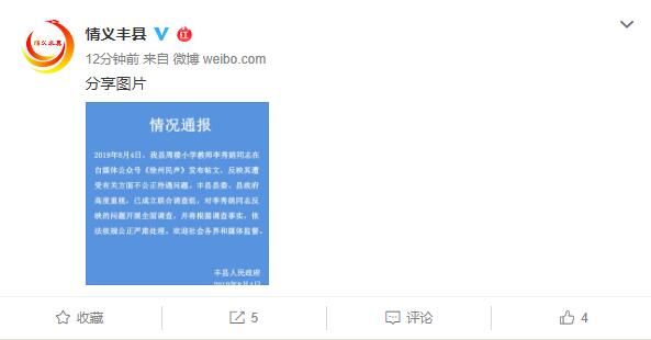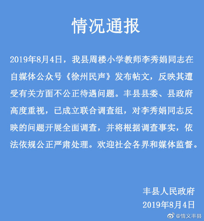 荔枝新闻讯 今日(8月4日),徐州女教师李秀娟通过网络发布求助信,自称和丈夫长期遭到有关方面的不公正对待,“准备离开这个世界”。下午,徐州丰县人民政府通过官方微博@情义丰县 回应,丰县县委、县政府高度重视,已成立联合调查组,对李秀娟反映的问题开展全面调查,并将根据调查事实,依法依规公正严肃处理。