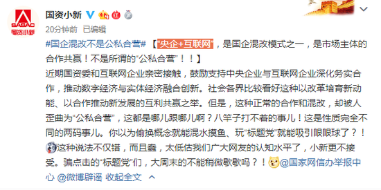 近期国资委和互联网企业亲密接触,鼓励支持中央企业与互联网企业深化务实合作,推动数字经济与实体经济融合创新。社会各界比较看好这种以改革培育新动能、以合作推动新发展的互利共赢之举。但是,这种正常的合作和混改,却被人歪曲为“公私合营”,这都是哪儿跟哪儿啊?八竿子打不着的事儿!这是性质完全不同的两码事儿。你以为偷换概念就能混水摸鱼、玩“标题党”就能吸引眼眼球了?!