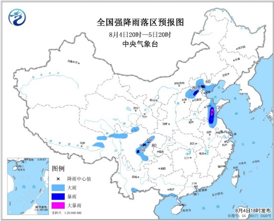 预计,8月4日20时至5日20时,山西东北部、河北中北部、北京大部、天津中东部、山东中部、江苏北部、安徽东北部、西藏东北部、青海东南部、四川西北部和中部、云南南部、广西南部和广东西南部等地有大到暴雨,其中,山东南部局地有大暴雨(100~120毫米)。上述部分地区伴有短时强降水(最大小时降雨量30~50毫米),局地有雷暴大风等强对流天气。