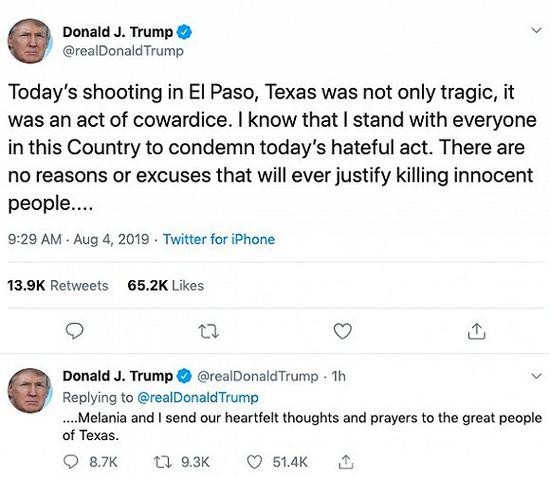 随后特朗普还在另一条推文中称,这次枪击事件不仅是一出悲剧,更是懦夫所为,他和妻子梅拉尼娅向得克萨斯民众表达衷心的思念与祈祷。