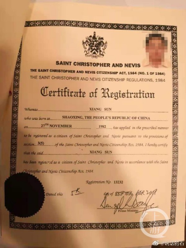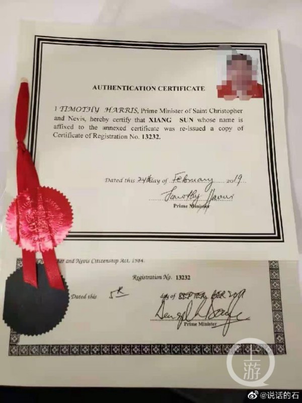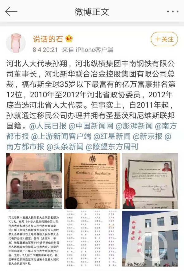 8月5日报道,8月4日晚,微博网友@说话的石 爆料,指河北省人大代表、河北纵横集团丰南钢铁有限公司董事长、河北新华联合冶金控股集团有限公司总裁孙翔具有双重国籍,其除中国国籍外,还有圣基茨和尼维斯联邦国籍。