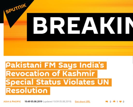 巴基斯坦外长库雷希(Mehmood Qureshi)谴责印度取消查谟和克什米尔邦“特殊地位”的举动,称此举违反了联合国关于该地区地位的决议。