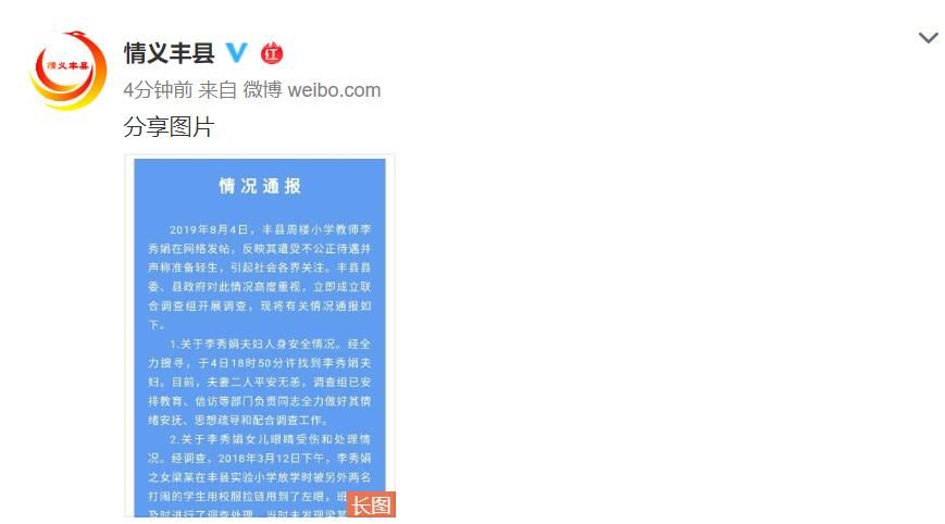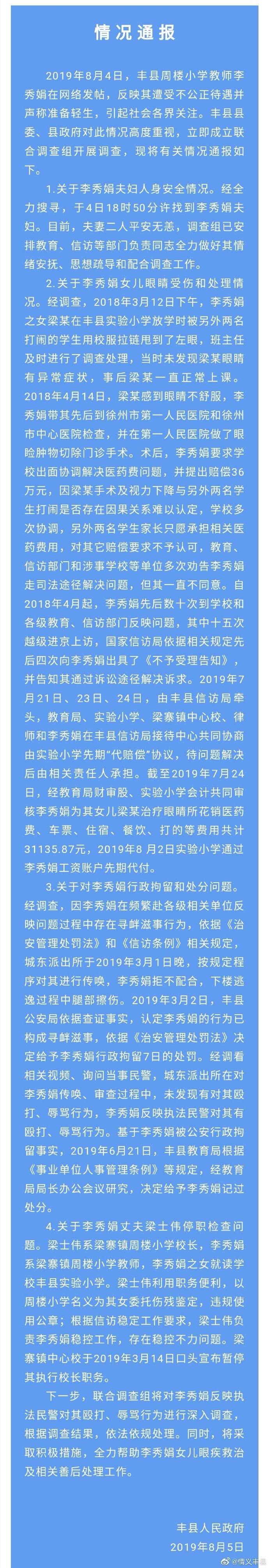 2019年8月4日,丰县周楼小学教师李秀娟在网络发帖,反映其遭受不公正待遇并声称准备轻生,引起社会各界关注。丰县县委、县政府对此情况高度重视,立即成立联合调查组开展调查,现将有关情况通报如下。