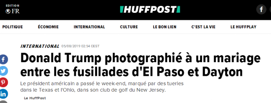 赫芬顿邮报8月5日报道截图: 《埃尔帕索枪击案与代顿枪击案间隙,特朗普被拍于婚礼现场》