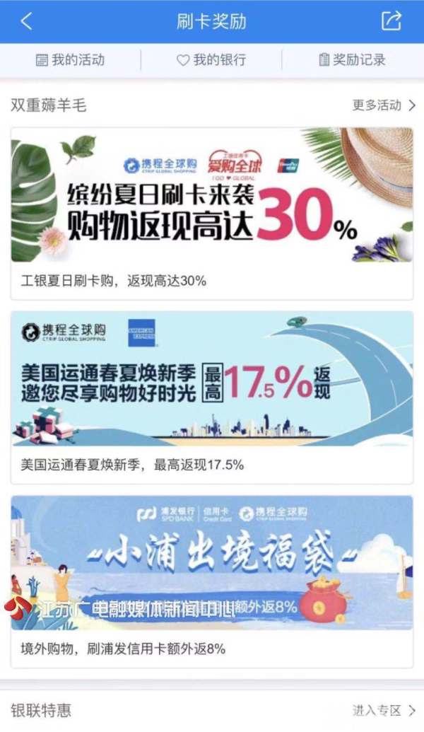 记者查询发现,多家银行信用卡组织都与旅游平台合作,为中国游客提供境外消费优惠。一些平台联合工行、浦发、美运通及银联,精选全球热门目的地商户,让国人在境外购物享优惠同时,叠加刷卡优惠,额外加返10%,最高返现比例可达30%。