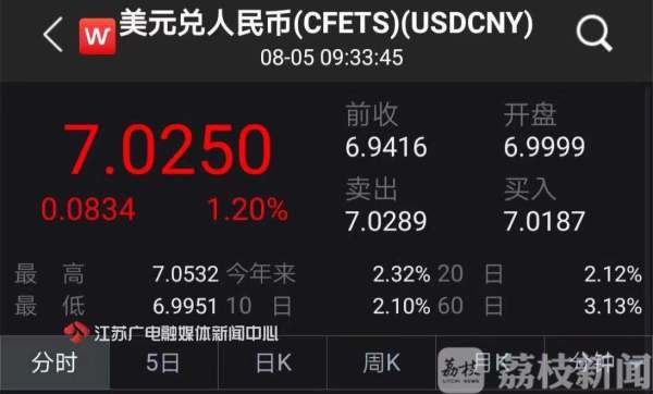 8月5日,离岸人民币兑美元及在岸人民币兑美元双双“破7”。