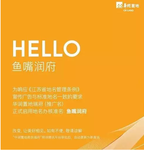 8月4日,河西南华润置地·瑞府就发飞机稿宣布,为响应《江苏省地名管理条例》宣传广告与标准地名一致的要求,项目正式启用地名办核准名:鱼嘴润府!