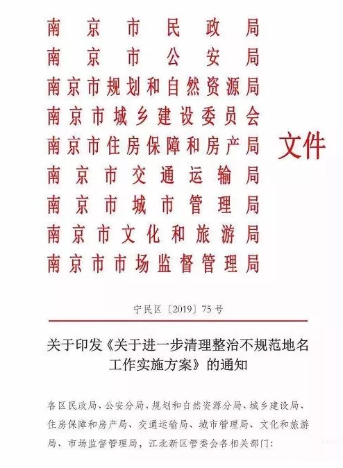 今年6月份,从南京市民政局获悉,根据南京市《关于进一步清理整治不规范地名工作实施方案》,各区已经将调查、收集的不规范地名上报给南京市民政局地名办,再由南京市地名协会对不规范地名清单进行审核,提出处理意见,同时进行公示。该工作于今年7月开始进行集中整治,9月中旬完成。