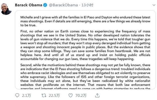 当天,前总统奥巴马也发表一份公开声明,明确呼吁更严格的枪支法。