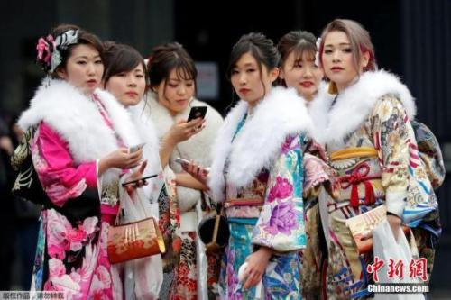资料图:年轻姑娘穿着色彩斑斓的和服。
