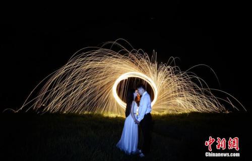 资料图:一对情侣在飞溅的火花下深情目视对方。 杨华峰 摄