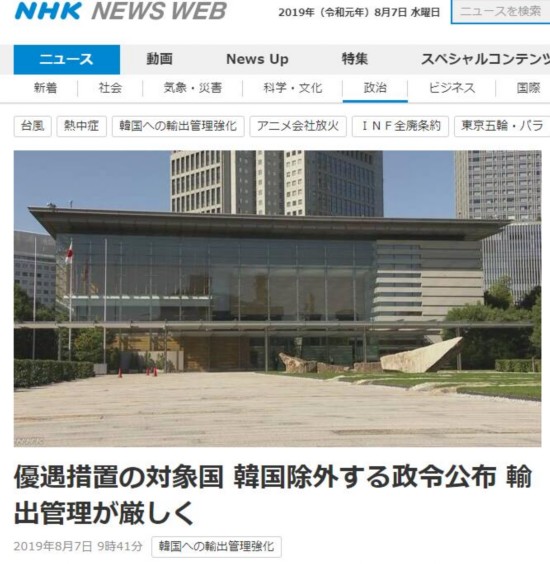 日本广播公司(NHK)7日报道称,日本政府2日在内阁会议中决定修改政令,将韩国排除出贸易优惠“白名单”,加强对韩国出口管控。7日上午,日本东京港区的国立印刷局公告栏上正式贴出官方通报,公布这一新政令。