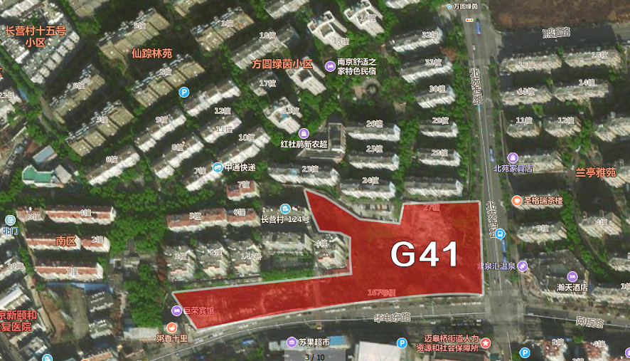 迈皋桥G41地块:(栖霞区迈皋桥街道长营村145号地块,位于迈皋桥板块,东至北苑西路、南至华电东路、西至住宅小区、北至方圆绿茵小区)。总用地面积20622.15㎡,出让面积20622.15㎡,用地性质为二类居住用地。经过8轮,被高科置业竞得,以总价5.2亿元成交,楼面价16268元/㎡。此外,原先出让要求中提到地块内应配建社区中心一座。并且地块竞价达到最高限价时停止竞价,改为在本地块内竞争人才房建筑面积,面积最多者竞得。人才房建成后无偿移交给栖霞区政府。地块内住宅建筑100%实行全装修和成品交付。