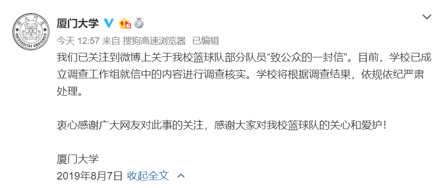 荔枝新闻讯 厦门大学今日中午就CUBA厦大队员联名举报教练一事进行通报说明,通报全文如下: