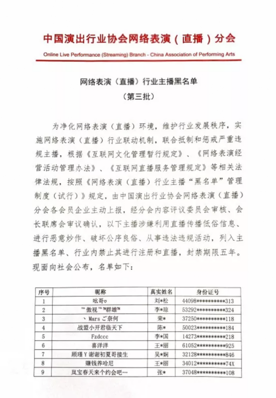 据CAPA网络表演直播分会消息,根据《网络表演(直播)行业主播“黑名单”管理制度(试行)》,中国演出行业协会网络表演(直播)分会(以下简称“分会”)现向社会公布第三批主播黑名单,被列入黑名单的主播将在行业内禁止注册和直播,封禁期限5年。近期,一些低俗、恶意炒作、有碍公序良俗的违法违规直播事件多次出现,引发社会广泛关注,损害了行业形象。各直播平台严格自律,积极承担主体责任,第一时间向分会上报了劣迹主播信息及其违规证据,分会组织内容评议委员会专家组进行审核,并经分会会长联席会讨论通过,正式确定第三批网络表演(直播)行业主播“黑名单”,现将名单公布如下:
