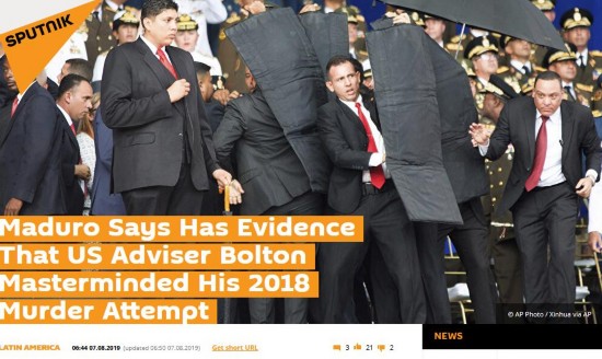 俄罗斯卫星通讯社注意到,去年12月,马杜罗就曾指责博尔顿有意推翻他,并将其置于死地。马杜罗2018年12月12日曾在记者会上说,“博尔顿在制定一个通过暴力和政变来安插过渡政府的计划。博尔顿在策划我的谋杀。他在与哥伦比亚一同在不同地方训练雇佣兵和准军事组织,哥伦比亚总统伊万 杜克也参与了这项计划。”