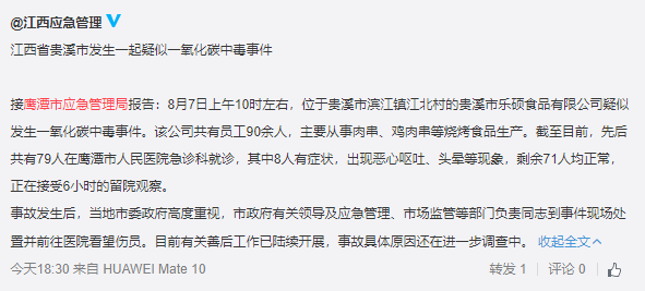 荔枝新闻讯 接鹰潭市应急管理局报告:8月7日上午10时左右,位于贵溪市滨江镇江北村的贵溪市乐硕食品有限公司疑似发生一氧化碳中毒事件。该公司共有员工90余人,主要从事肉串、鸡肉串等烧烤食品生产。截至目前,先后共有79人在鹰潭市人民医院急诊科就诊,其中8人有症状,出现恶心呕吐、头晕等现象,剩余71人均正常,正在接受6小时的留院观察。