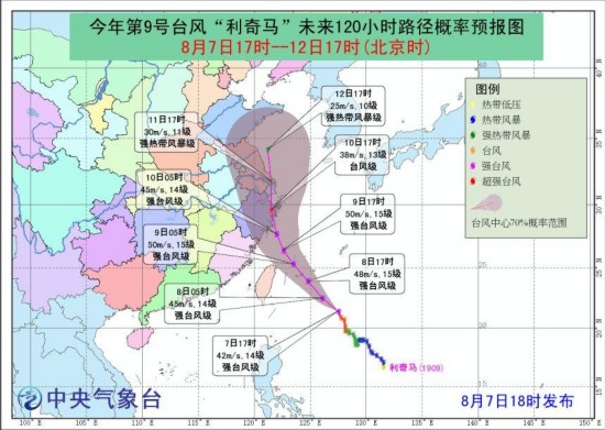 预计“利奇马”将以每小时15公里左右的速度向西北方向移动,强度逐渐增强,最强可达强台风级 (14~15级,42~48米/秒),并逐渐向浙江沿海靠近。