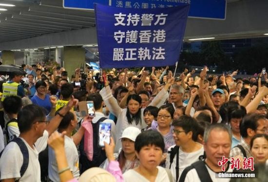 7月20日下午,30余万香港市民在金钟添马公园参加“守护香港”集会,共同守护香港法治的核心价值,维护法治,反对暴力。图为集会结束后,一名市民高举支持警方的横幅,市民纷纷竖起大拇指,高喊“支持警察”的口号。中新社记者 张炜 摄