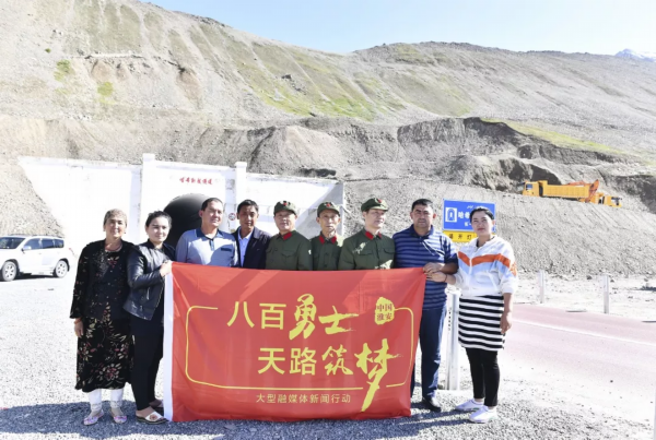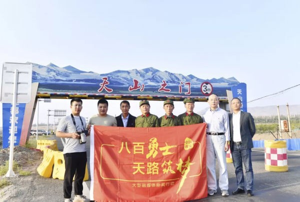 报道组成员与老兵在“天山之门”前合影