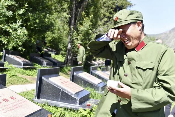 老兵王林在牺牲的战友墓碑前痛哭