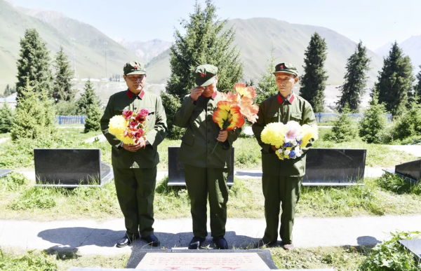 在乔尔玛烈士陵园,还有3位天山筑路烈士也来自淮安,他们分别是王克友、艾少平、周文飞。牺牲前,他们与胡永胜、谭广生同在军委工程兵建筑第一六八团,1974年一起挺进天山,参加修筑天山公路。此次重走天山公路,胡永胜、谭广生带着家乡战友们的重托,到乔尔玛烈士陵园,缅怀和祭奠3位曾经朝夕相处、为天山筑路光荣献身的战友。