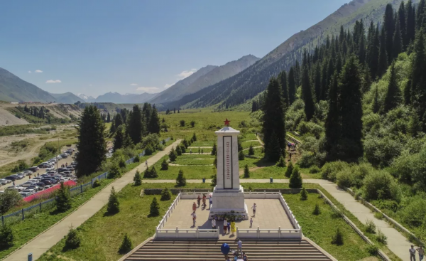 汽车由北向南行进,于当天中午11时许到达乔尔玛烈士陵园。为修筑天山公路,13000多名官兵接续奋战了10年,有168人献出了宝贵生命,长眠在这座陵园。