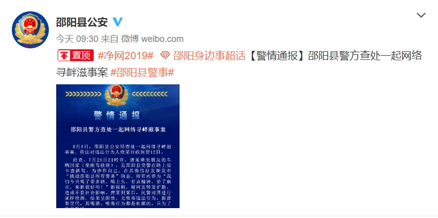 荔枝新闻讯 湖南省邵阳市邵阳县公安官方微博8月8日发布警情通报称,8月6日,邵阳县公安局查处一起网络寻衅滋事案,依法对违法行为人唐某行政拘留12日。