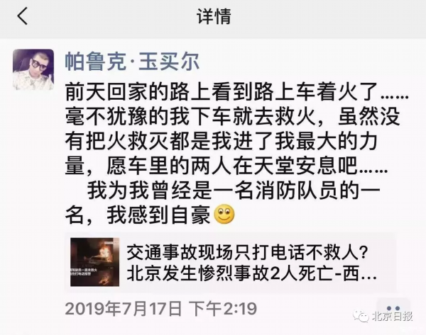 他在朋友圈里写道:“虽然没有把火救灭,但是我尽了我最大的力量,愿车里的两人在天堂安息吧……我为我曾经是一名消防队员而感到自豪。”