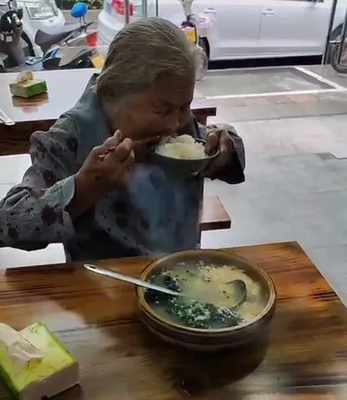 视频中一位老奶奶坐在饭桌前桌上摆放着一盆汤菜和一碗米饭老奶奶手中拿着一元钱硬币想要付钱却被店主拒绝了