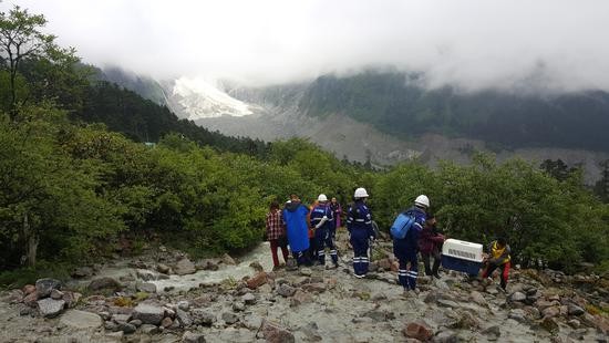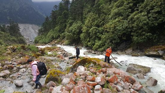 8日上午,小孩走失位置——海螺沟景区的红石滩景点还是有点蒙蒙细雨。据连日来参加救援的景区工作人员介绍,因为这几天景区内时不时都有雨,所以红石滩小溪的水流已经比小孩失踪当天大了很多。