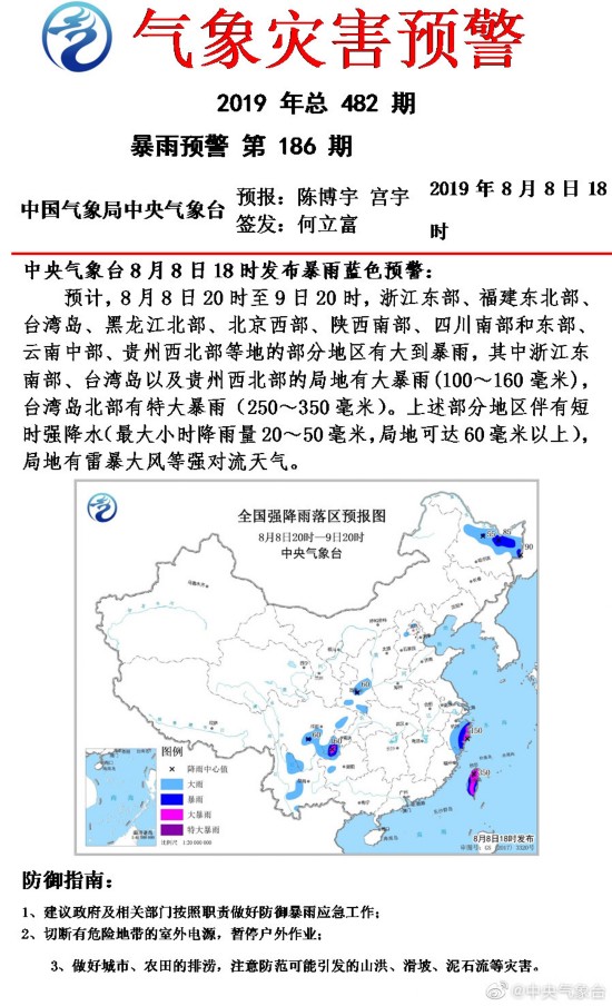 预计,8月8日20时至9日20时,浙江东部、福建东北部、台湾岛、黑龙江北部、北京西部、陕西南部、四川南部和东部、云南中部、贵州西北部等地的部分地区有大到暴雨,其中浙江东南部、台湾岛以及贵州西北部的局地有大暴雨(100~160毫米),台湾岛北部有特大暴雨(250~350毫米)。上述部分地区伴有短时强降水(最大小时降雨量20~50毫米,局地可达60毫米以上),局地有雷暴大风等强对流天气。