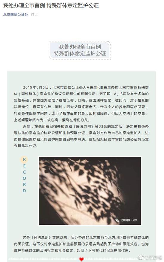 北京国信公证处发文指出,2019年8月5日,北京市国信公证处为A先生和B先生办理北京市首例特殊群体(同性群体)意定监护协议公证和生前预嘱公证。据了解,A、B两位有十多年的感情基础,并在国外领取了结婚证书,但限于我国法律规定,彼此间,对于相互的法律定位一直留有心结,同时,因为父母逐渐老去,未来个人的养老和医疗问题,特别是住院签字问题,成为了摆在面前的最大困扰和障碍。但因为立法上的空白,上述问题始终作为一块心病,萦绕在他们心头。