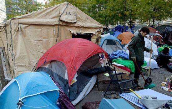 2011年11月15日凌晨,纽约警方展开突击行动,对“占领华尔街”运动的大本营祖科蒂公园进行强制驱逐,不允许示威者再携带帐篷、睡袋进场。行动中约200名抗议者因为扰乱治安行为等原因被捕。