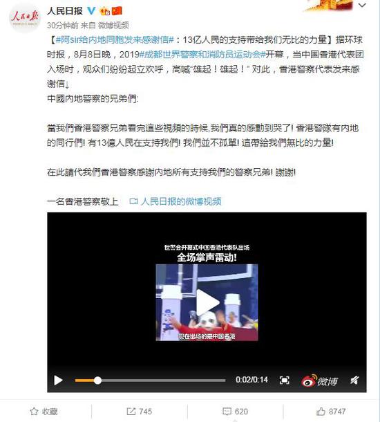 据环球时报,8月8日晚,2019#成都世界警察和消防员运动会#开幕,当中国香港代表团入场时,观众们纷纷起立欢呼,高喊“雄起!雄起!” 对此,香港警察代表发来感谢信↓