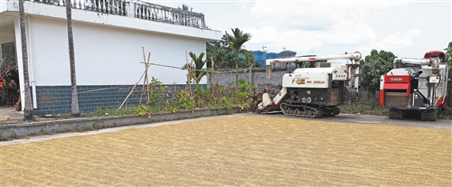 在安徽荃银高科种业公司南繁基地,工作人员收获水稻后晾晒稻谷。经济日报-中国经济网记者 乔金亮摄