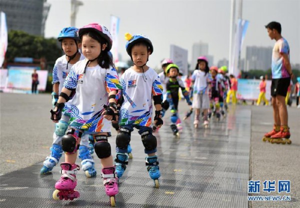 8月8日,小朋友们在河南省分会场练习轮滑。当日,2019年全国“全民健身日”活动河南省分会场暨郑州市全民健身日群体展演活动在河南省郑州市郑东新区如意湖广场举行。本次活动以“健康中国·你我同行”为主题,展示了广播体操、健身秧歌、瑜伽等全民健身项目。 新华社记者李嘉南摄