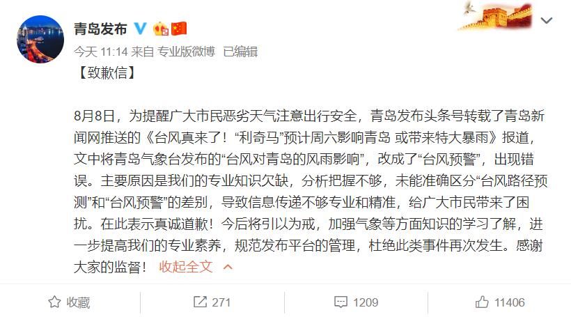 8月8日,为提醒广大市民恶劣天气注意出行安全,青岛发布头条号转载了青岛新闻网推送的《台风真来了!“利奇马”预计周六影响青岛 或带来特大暴雨》报道,文中将青岛气象台发布的“台风对青岛的风雨影响”,改成了“台风预警”,出现错误。主要原因是我们的专业知识欠缺,分析把握不够,未能准确区分“台风路径预测”和“台风预警”的差别,导致信息传递不够专业和精准,给广大市民带来了困扰。在此表示真诚道歉!今后将引以为戒,加强气象等方面知识的学习了解,进一步提高我们的专业素养,规范发布平台的管理,杜绝此类事件再次发生。感谢大家的监督!