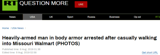 RT说,虽然这名男子奇怪的举动在理论上来说是合法的,但这样的行为无疑会引发人们的恐惧。RT称,就在上个周末,美国得克萨斯州埃尔帕索的一家沃尔玛超市刚刚遭受枪击,造成22人死亡,数十人受伤。