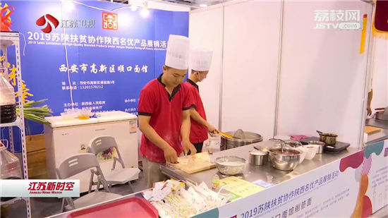 江苏台记者郝朦:说到陕西,美食都是一个绕不过去的话题,其中尤以各类各样的面食最为著名,在展会现场,很多商户也是把烹饪工具带了过来现场烹饪,让市民不用到陕西就能吃到地道的陕西美食。