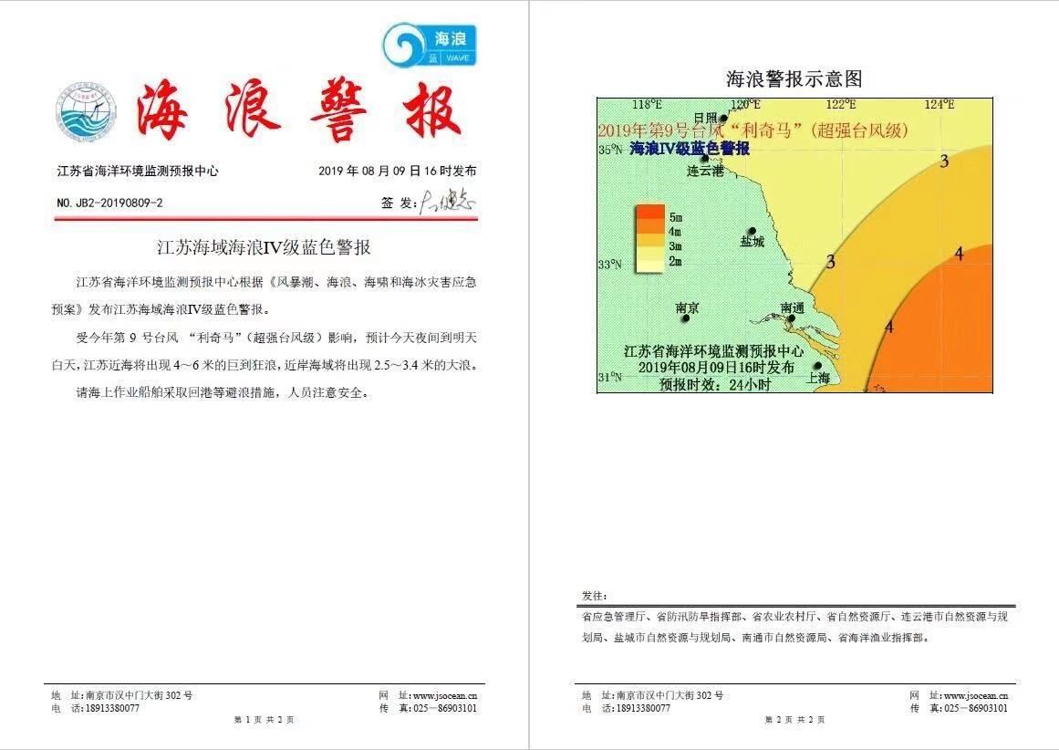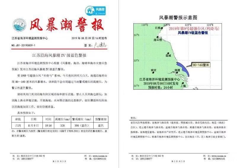 我苏网讯 为积极应对9号台风,今天下午16时,江苏省海洋环境监测预报中心根据《风暴潮、海浪、海啸和海冰灾害应急预案》同时发布江苏海域海浪Ⅳ级蓝色警报和沿海风暴潮Ⅳ级蓝色警报。