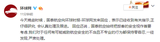 今天晚些时候,国泰航空向环球时报-环球网发来回应,表示已经收到有关指示,正仔细研究, 会认真处理及跟进。 回应还说,国泰航空始终把旅客的安全视作首要考虑,我们对于任何有可能威胁航空安全的不当且不专业的行为都保持零容忍,一经发现,严肃处理。
