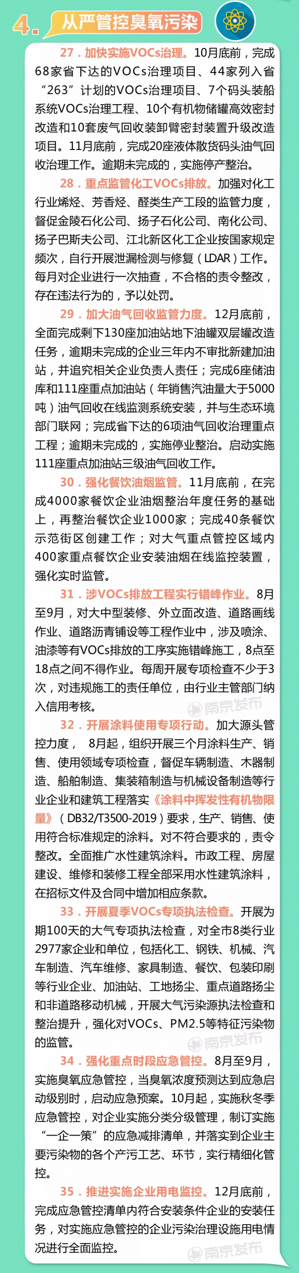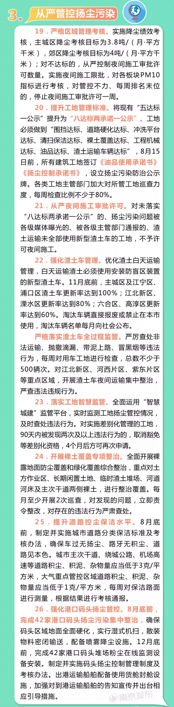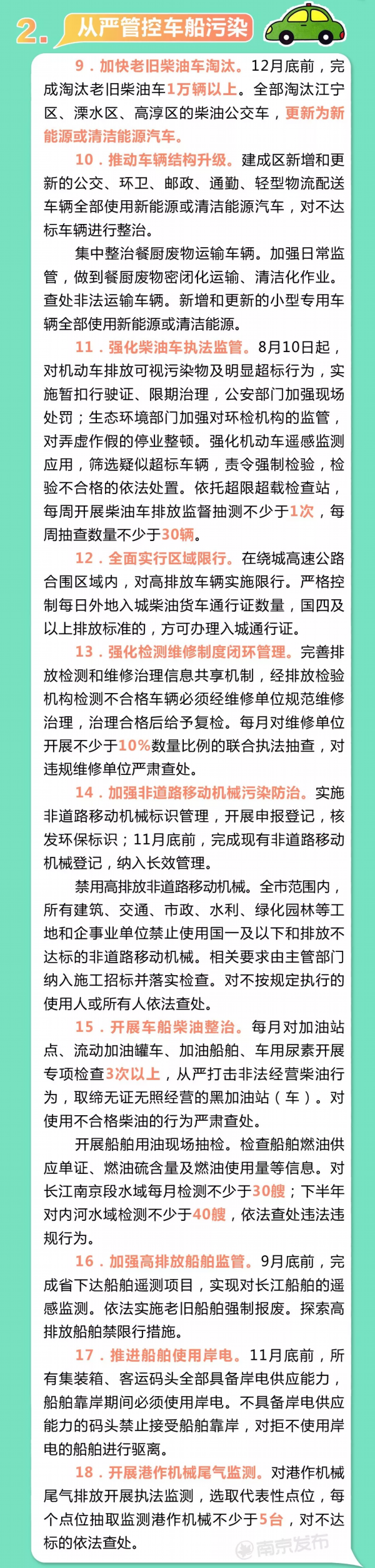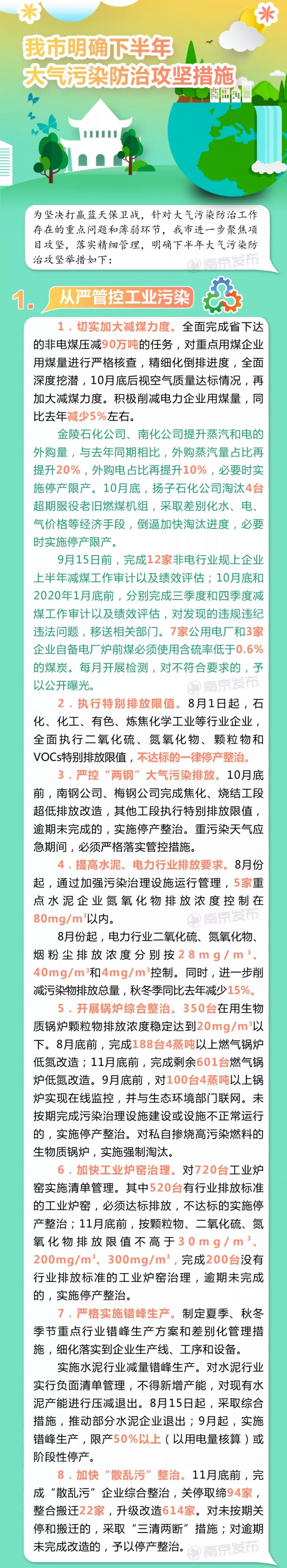 昨天,南京市出台 2019年下半年南京市大气污染防治攻坚措施《攻坚措施》,坚持“能用尽用、能快则快、能实必实、能严尽严”的原则,针对工业污染、车船污染、扬尘污染和臭氧污染,4项影响南京空气质量的主要污染源,对症下药制定了40条从严管控措施。力争在本年度剩下的月份提升空气质量,让南京人看到更多蓝天。