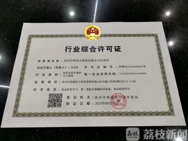“行业综合许可证”的实行,将大大缩短审批时间。比如:以往在相城区开办一家药房分公司,需要分别办理药品零售许可、医疗器械经营许可、食品经营许可等3个证,承诺办理时间要30个工作日左右,跑4、5个部门;现在,仅用3天时间,到1个窗口、跑1次就能办完。同时,扫一扫许可证上面的二维码,涉及的所有许可事项都能显示。