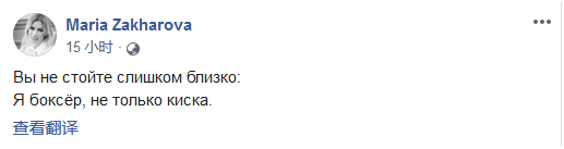 9日稍晚时候,扎哈罗娃在脸书上写道,“你们可不要离我太近了:我不止是一只小猫咪,还是一个拳击手”。